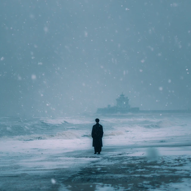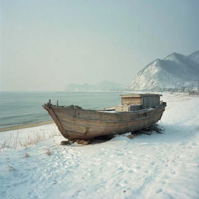 눈 온 바닷가의 녹슨 목선 위에 마음이 머물면서